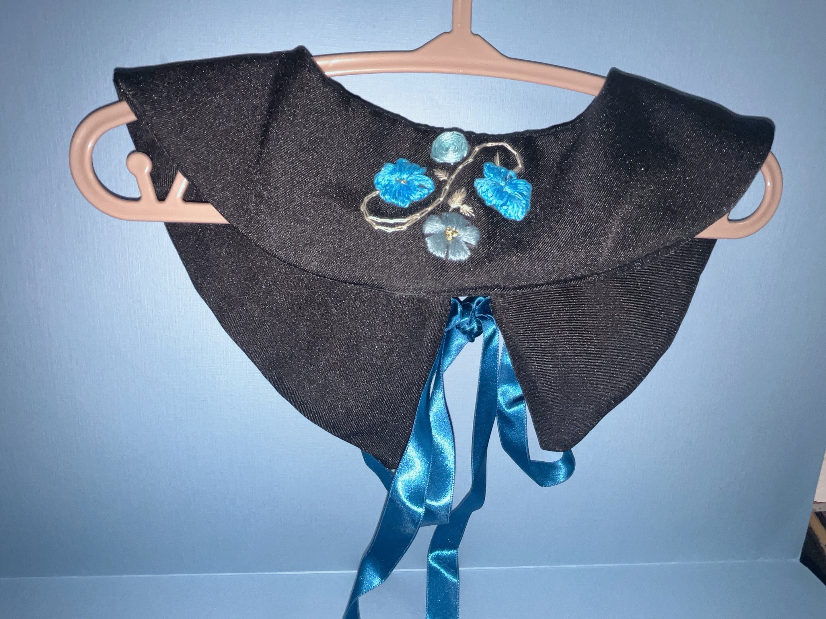 落ち着いた黒をベースに覚めるような蒼の花々をあしらった付け襟。